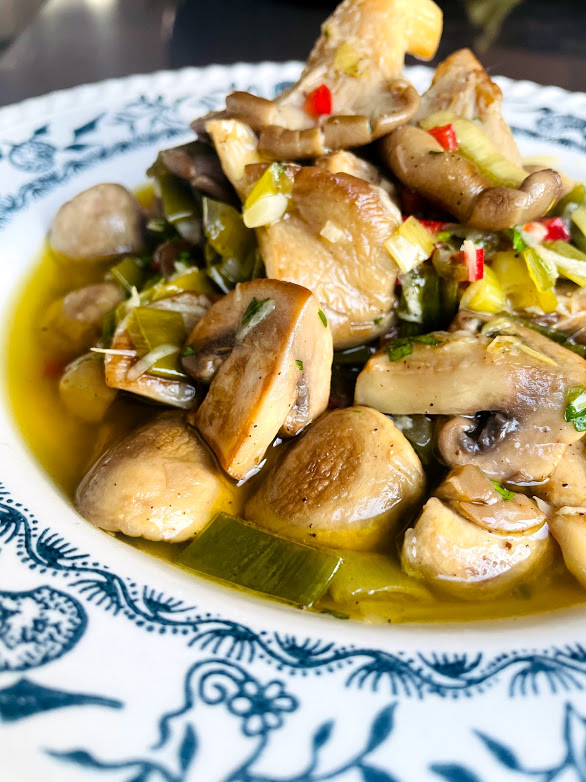 Mantarlar sıcakken tavadan direk olarak sosun içine alın. Önce oda ısısına gelmesini bekleyin. Ilınınca ince kıyılmış maydanoz ve taze soğanları ilave edin. Üzerini streç film ile kapatıp, buzdolabında en az 1 gece, tercihen 24 saat dinlenmeye bırakın. Servisten önce renk için yarım kapya biberi incecik kıyıp ekleyebilirsiniz. Ertesi gün soğuk veya oda ısısına gelince sosuyla birlikte servis edin.